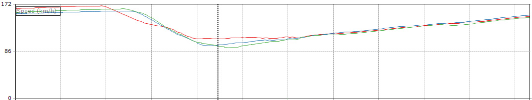 As you can see, my speed is much lower than the other two drivers. In fact I started to brake 50m earlier. It is very tempting to brake late here, and you will often hear talk in the Sebring paddock of just how late some drivers like to brake for Sunset Bend.