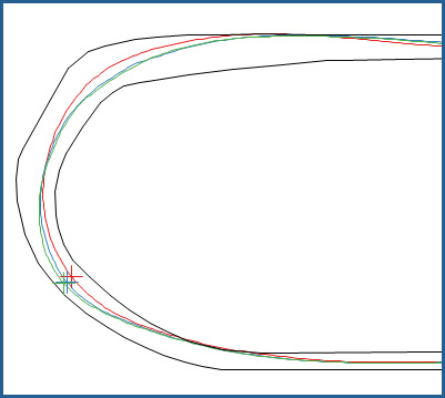 Nigel Greensall is on the left, outlined in red. He’s braking earlier to balance the car and maintain speed around the long bend.