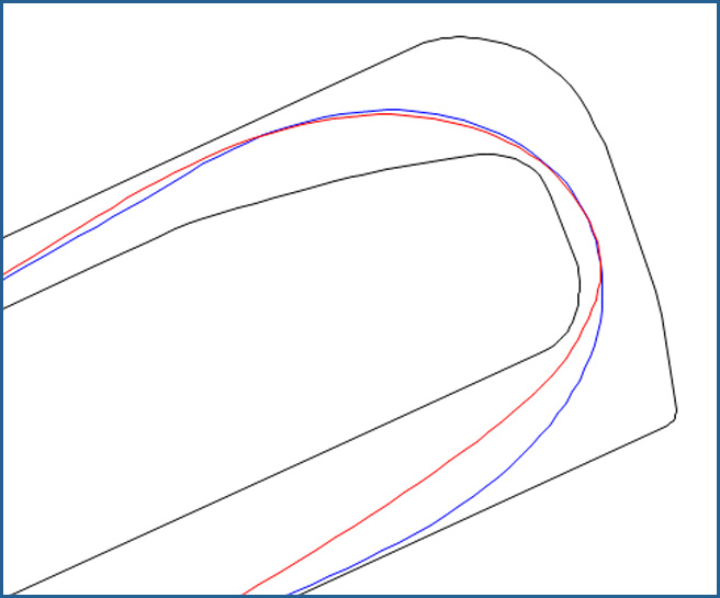 To see this line in action, have a look at the image on the left, which shows my preferred line in red, and my team mates line in blue. The red line misses the apex of Turn 12 by almost 2m, but maintains the same apex speed of 105mph as the blue line which clips the apex.